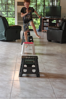 Anything to burn some excess energy when stuck inside. This is actually an event in the family Olympics, which we began while watching the real Olympics and have repeated from time to time. Scott likes to keep score and give prizes. In addition to stool hurdles most recently, they did races as animals-bunny hop, seal slide in socks (which I don't normally let them wear in the house without shoes because someone is ALWAYS slipping and falling), wheelbarrow, etc-again anything to burn energy, having fun and acting crazy! When all the points were added, Ryan won and they all made prizes for each other. Scott is into folding paper into things lately. Ryan made certificates of participation-after asking me how to spell that word, and Ashley made the boys paper cameras in their favorite colors. Fun sibling bonding time! Greg and I are always telling them how we hope that when they are grown and have their own families that they will enjoy each other as much as we enjoy Aunt Emily, Uncle Jake, Aunt Jodi, and Uncle Chris! We are blessed to have great family and nutty children!